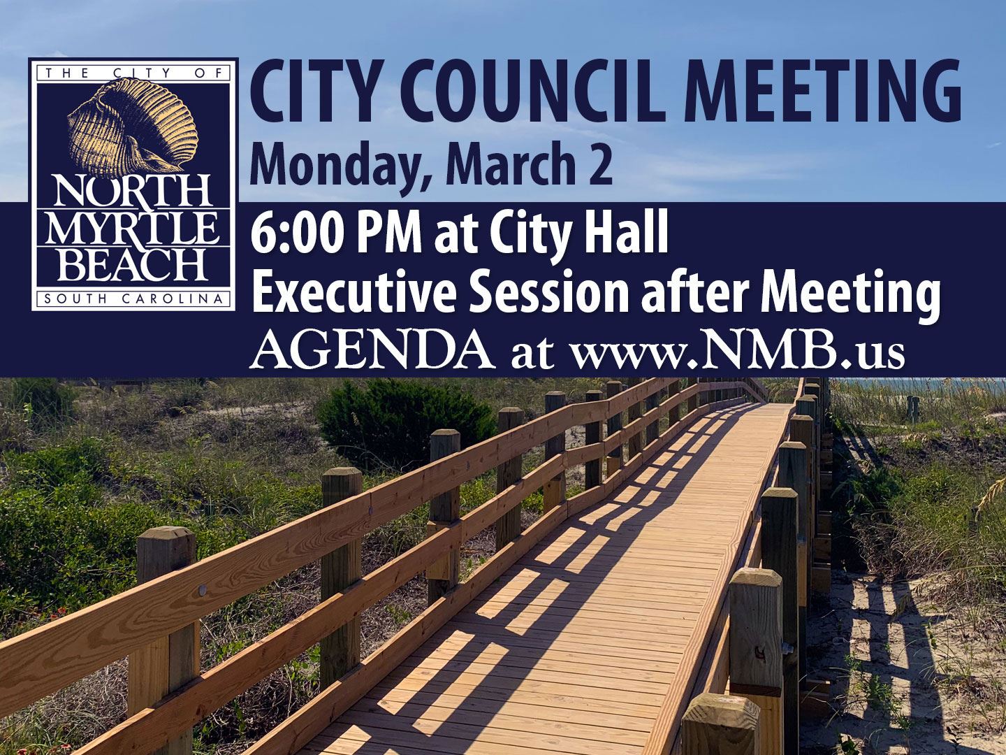 NORTH MYRTLE BEACH, S.C. -- The North Myrtle Beach City Council will meet in a regularly scheduled meeting on Monday, March 2, at 6:00 PM at City Hall.