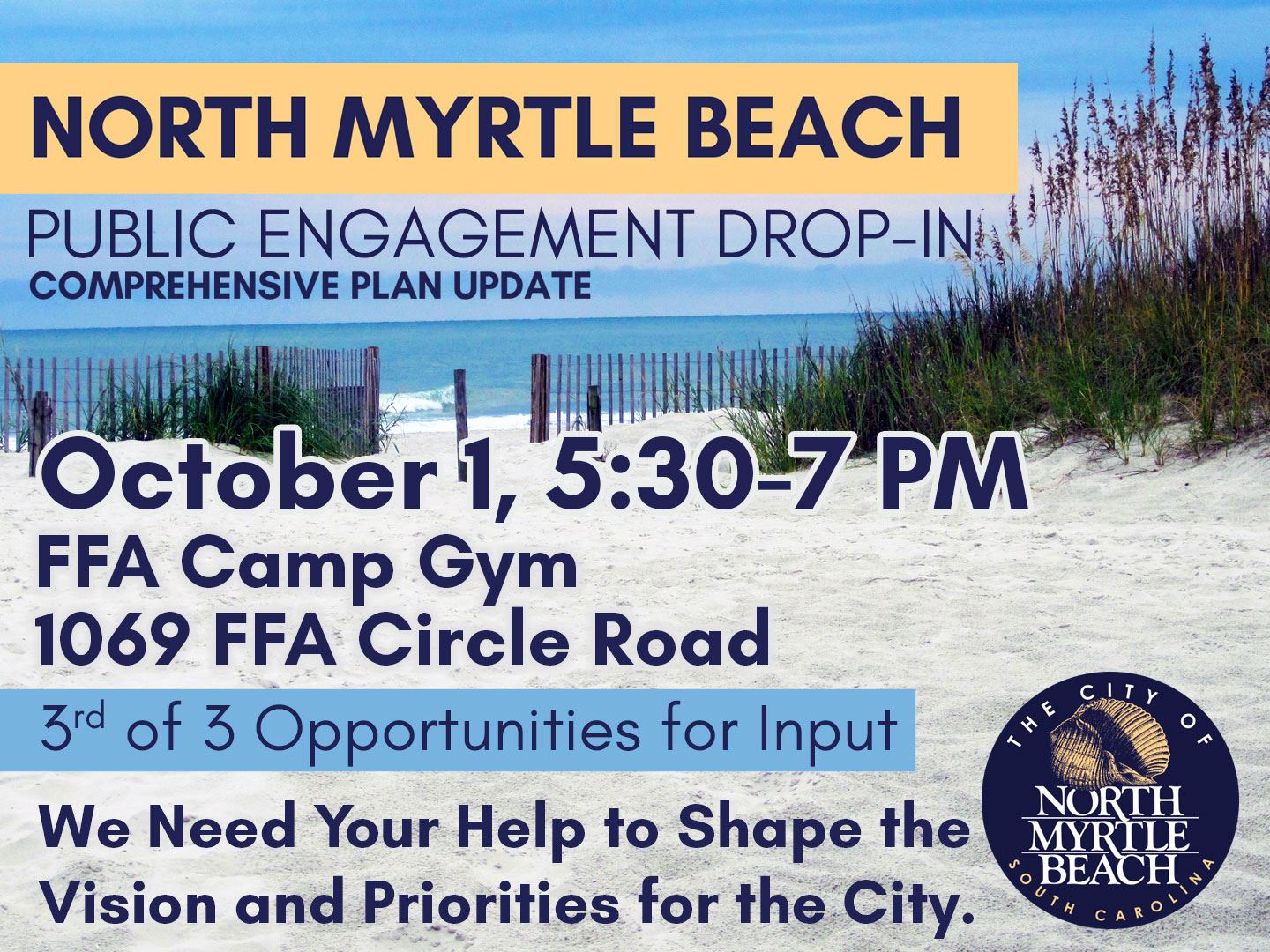 In addition to the drop-ins, the City has launched a Comprehensive Plan Community Survey, open now through Wednesday, October 8. This survey provides another way for community members to offer valuable feedback, which will help shape the vision and priorities for the future of North Myrtle Beach.