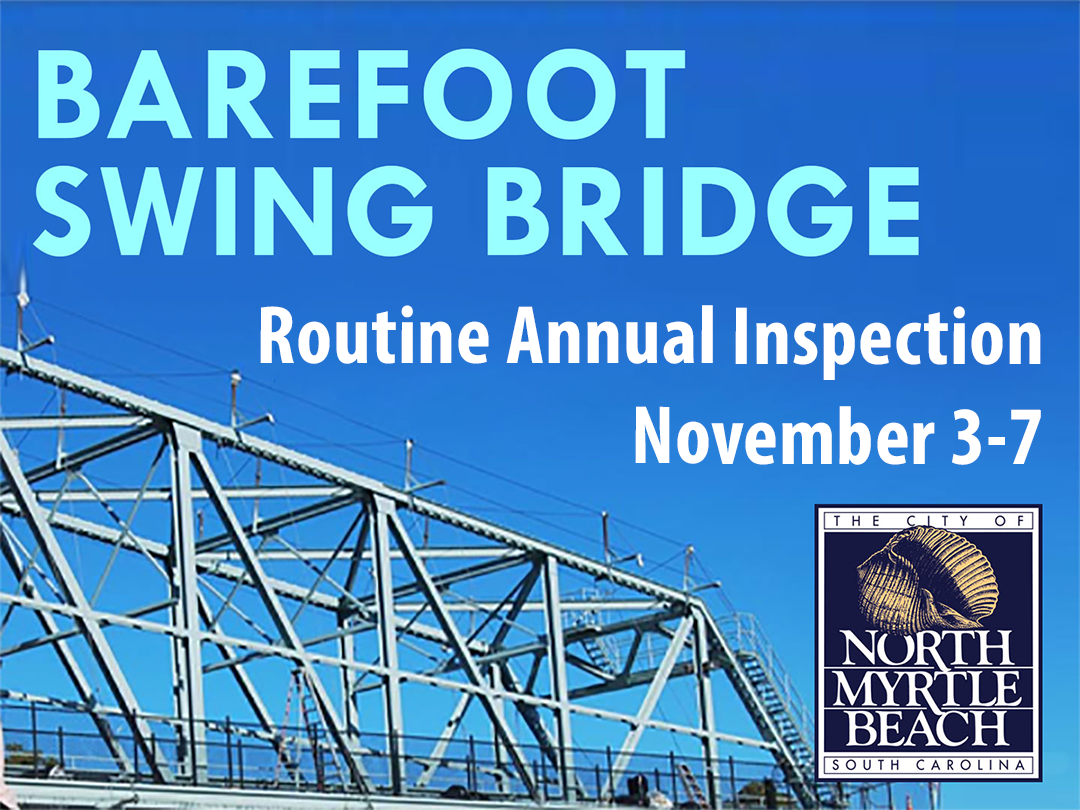 NORTH MYRTLE BEACH, S.C. -- The City of North Myrtle Beach will conduct its annual routine inspection of the Barefoot Swing Bridge from Monday, November 3, through Friday, November 7.